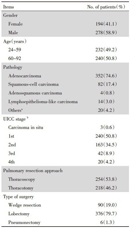 选取2018年1-12月在中山大学肿瘤防治中心行肺癌手术的患者作为研究对象。纳入标准包括:≥ 18岁; 病理诊断为肺恶性肿瘤; 行胸腔镜或开胸术。排除标准包括:手术前存在感染或处于感染潜伏期; 其他恶性肿瘤肺转移到肺部者。本研究在482例肺癌患者中排除10例不符合标准的患者, 最终纳入患者472例。