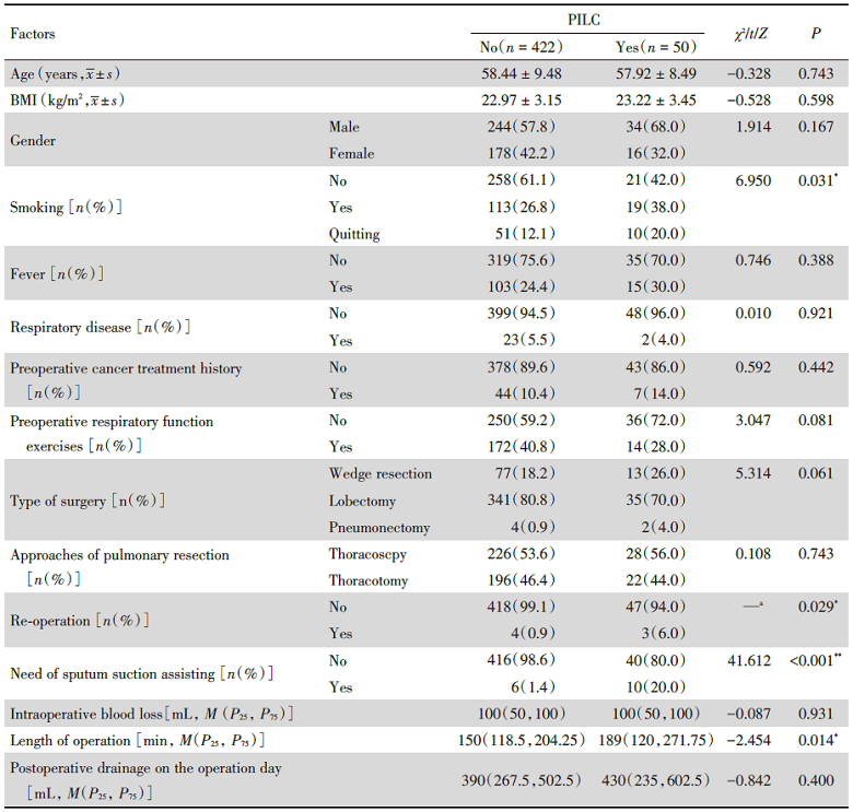 472例肺癌患者中有50例诊断为PPILC, 发生率为10.6%。472例患者的一般资料见表1。
