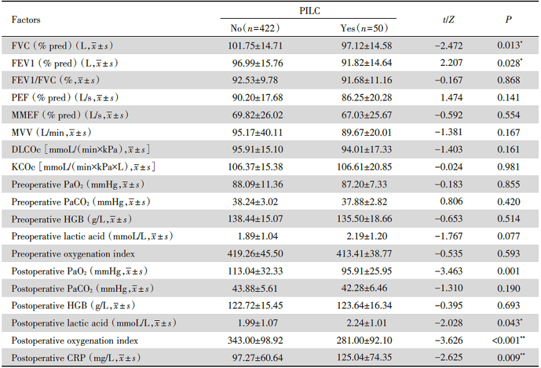 单因素分析结果显示, 吸烟、二次手术、辅助吸痰、手术时长(min)、FVC(%pred)、FEV1(%pred)、术后PaO2、术后乳酸、术后氧合指数、术后CRP、肺通气功能障碍等指标不同的患者其是否发生PPILC的差异具有统计学意义(P< 0.05), 具体见表2~表4。