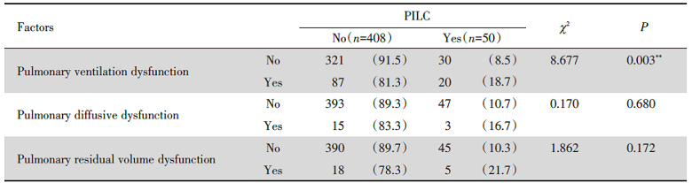 | 表4 肺癌患者术前肺功能情况对术后并发肺部感染影响的单因素分析 Tab.4 Single factor analysis of the influence of preoperative pulmonary function on PPILC |