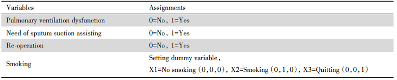 术后肺部感染的诊断采用中国人民共和国卫生行业标准(WS 382-2012)[9]:肺炎诊断, 该标准于2013-02-01实施。医院获得性肺炎诊断标准需同时满足以下三条:(1)至少行两次胸片检查(对无心、肺基础疾病, 如呼吸窘迫综合症、支气管肺发育不良、肺水肿、慢性阻塞性肺疾病或充血性心力衰竭等的患者, 可行一次胸片检查), 并至少符合以下一项:新出现或进行性发展且持续存在的肺部浸润阴影、实变或空洞形成。(2)至少符合以下一项:(a)发热(体温> 38℃)且无其他明确原因; (b)外周血WBC> 12× 109/L或< 4× 109/L; (c)年龄≥ 70岁的老年人没有其他明确原因而出现神志改变。(3)至少符合以下两项:(a)新出现的脓痰或痰的性状发生变化, 或呼吸道分泌物增多, 或需要吸痰次数增多; (b)新出现的咳嗽、呼吸困难或呼吸频率加快, 或原有的咳嗽、呼吸困难或呼吸急促加重; (c)肺部啰音或支气管呼吸音; (d)气体交换情况恶化, 氧需求量增加或需要机械通气支持。