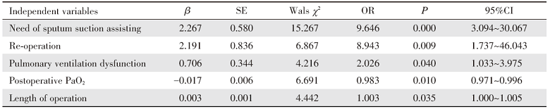 | 表6 肺癌术后并发肺部感染的多因素logistics回归分析 Tab.6 Multivariate logistic regression analysis of PPILC Independent variables |