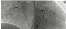 2021-10-09 01∶ 57行心电图示:V1-6导联R波递增不良, V1-5导联ST段弓背抬高, 见图1。2021-10-09 02∶ 33行胸痛指标检测提示:高敏肌钙蛋白T 21.08 pg/mL, B型氨基端尿钠肽原 2 160 pg/mL。遂于2021-10-09 02∶ 50进行冠脉造影, 术中见左主干、右冠未见明显狭窄, 前降支近段狭窄30 %, 钝缘支近段狭窄30%, 见图2。