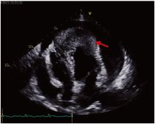 | 图3 患者超声心动图图像 注:红箭头所示为心尖部占位可能。Fig.3 Echocardiography of the patient Note: The red arrow indicated the possible neoplasm at the apex. |