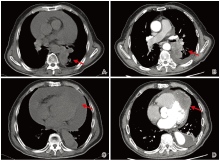 肺癌合并心脏转移多是晚期肺癌患者, 患者的一般情况多很差, 且常存在全身多处转移; 但本例患者一般情况尚可, 并未发现其他部位的转移。肺癌合并心脏转移临床常漏诊, 多为肺癌患者尸检发现。尽管该患者影像学和病理学诊断较符合肺癌心脏转移的诊断, 但临床表现不太符合。鉴于本病例, 由于患者原发病灶为左下肺鳞状细胞癌, 病灶临近纵隔, 肿瘤组织可能通过周围转移侵犯纵隔及心肌组织。心脏转移通常出现在肿瘤疾病的播散期, 肿瘤细胞可以通过血液或淋巴传播或通过血管壁扩散, 直接到达心肌组织, 产生类似急性心肌梗死的临床症状。
