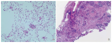 +2021-10-25 12∶ 51行左下肺纤维气管镜活检, 病理结果显示:(左下叶背段开口穿刺)鳞癌。免疫组化:CK7(散在+), TTF-1(-), Napsin A(-), CK5/6(+), P40(+), P63(+), ALK(D5F3)(-), Ki-67(约30%+), PD-L1(22C3)(约60%+), CD56(灶性弱+), CgA(-), Syn(-)(图5B)。诊断为肺鳞癌Ⅳ B期(T3N1M1C); 心包内占位, 考虑转移。