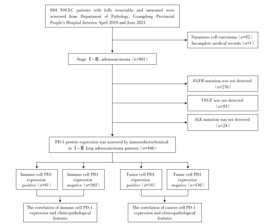 本研究选取自2010年4月到2021年6月期间, 广东省人民医院病理科确诊完全可手术切除、未经新辅助、辅助治疗的NSCLC患者884例, 排除鳞癌82例、病历资料不全者1例、EGFR突变未检测者276例、VEGF未检测者55例、ALK融合未检测者24例, 见图1。