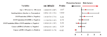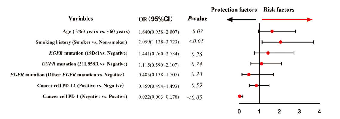 免疫细胞PD-1、肿瘤细胞PD-1发生的相关风险因素探究结果显示(二元logistics):吸烟者(对比非吸烟者)更容易出现免疫细胞PD-1蛋白表达阳性; Ⅲ期(对比Ⅰ期患者)的患者更容易出现肿瘤细胞PD-1表达阳性; 而肿瘤细胞和免疫细胞上PD-1蛋白表达呈正相关。在既往的研究中, 很少把免疫细胞、肿瘤细胞上PD-1的表达结合起来分析。因此, 与肿瘤细胞及肿瘤组织周围免疫细胞PD-1表达具有相关性的临床病理变量也能够在本研究中得到进一步阐明。