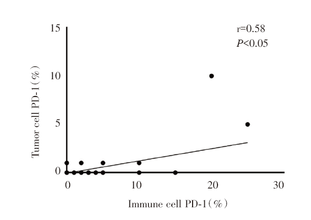 将P<0.1的临床病理特征相关指标纳入二元logistics回归模型中, 多因素回归结果显示:免疫细胞PD-1阳性表达在吸烟患者(对比非吸烟者)中更常见[比值比(odds ratio, OR)2.059, 95%可信区间(confidence interval, CI)1.138~3.723, P<0.05, 见图2], 并且免疫细胞PD-1表达与肿瘤细胞PD-1表达之间呈正相关(r=0.58, P<0.05), 见图3。