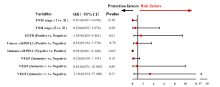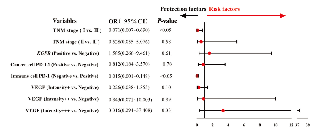 将P<0.1的临床病理特征相关指标纳入二元logistics回归模型中, 结果显示:对比Ⅰ期患者, 肿瘤细胞PD-1表达阳性在Ⅲ期的患者中更常见(OR:45.92, 95%CI 5.616~375.507, P<0.05, 图4), 并且肿瘤细胞PD-1表达与免疫细胞PD-1表达之间呈正相关(r=0.58, P<0.05), 见图3。