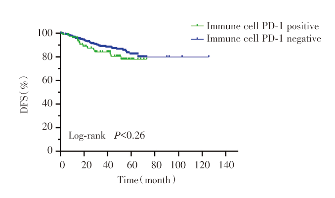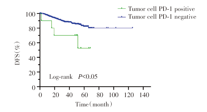 本研究结果显示, 肿瘤细胞PD-1阳性的早期肺腺癌患者复发风险更高, 而免疫细胞PD-1表达与早期肺腺癌患者复发风险无关。