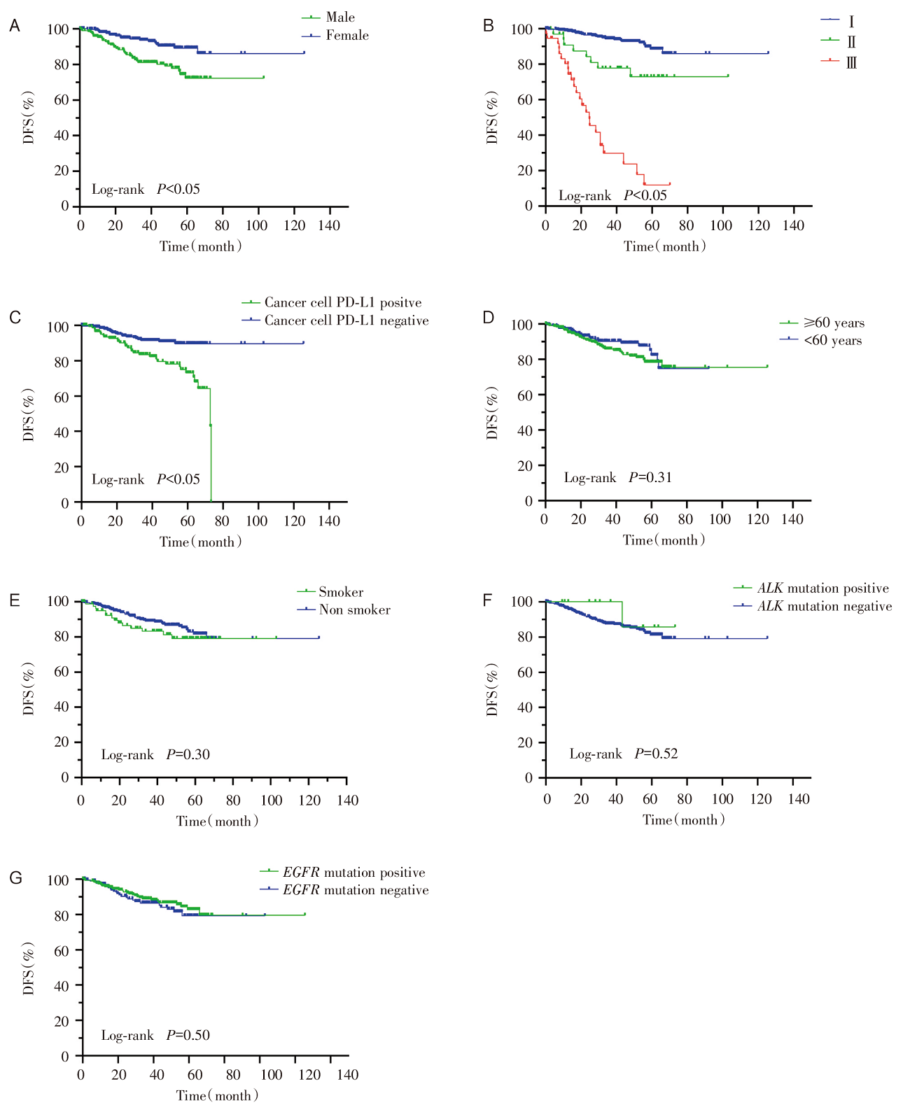 Kaplan-Meier生存分析结果显示, 肿瘤细胞PD-1阳性表达患者的复发风险更高[风险比(hazard ratio, HR)6.5, 95%CI 1.227~34.59, DFS:P<0.05, 见图5], 而免疫细胞PD-1表达与PD-1总人群的复发风险之间没有统计学意义(DFS:P=0.26, 见图6)。男性、分期越晚、肿瘤细胞PD-L1阳性在PD-1人群中的复发风险更高(见图7A~C); 患者年龄、吸烟状态、ALK突变、EGFR突变状态与PD-1人群复发无关(见图7D~G)。