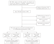 采用免疫组化法(immunohistochemical, IHC), PD-1抗体采用PD-1(MRQ-22)单克隆抗体(公司:基因科技/Gene Tech)。从每个肿瘤块上切下4 μ m厚的切片, 安装在载玻片上, 烤片60 ℃, 1 h, 脱蜡并复水。接着进行EDTA热抗原修复, 而后样本在压力锅中的EDTA(pH 8.0; PD-1)中微波炉加热10 min。配置PD-1一抗, 室温孵育30 min。滴加二抗, 37 ℃水浴箱孵育30 min。DAB显色8 min。苏木素染色1 min, 风干, 封片。采用已知表达PD-1的肺腺癌标本切片用作阳性对照。
