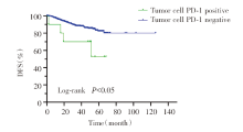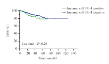 PD-1蛋白表达在免疫细胞和肿瘤细胞中分别进行评估, 并表示为总肿瘤面积的百分比[20]。只有具有≥100个肿瘤细胞并且仅包括具有部分或完全膜染色的肿瘤细胞的标本才被考虑用于最终分析。当在≥1%的免疫细胞或肿瘤细胞中检测到任何强度的阳性染色时, 则分别被视为免疫细胞PD-1表达阳性或肿瘤细胞PD-1表达阳性。