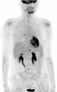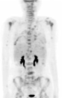 2009年5月患者自行发现右乳肿物, 遂于我院门诊行乳腺B超检查, 疑右乳腺癌保乳术后复发而收入院。入院后行PET检查示右乳腺癌保乳术后局部复发, 并全身多发性转移(见图1)。予化疗6周期后, 部分缓解。遂于2009年10月行右乳单纯切除术。术后病理结果示:(右侧) 乳腺浸润性导管癌, Ⅱ 级。肿瘤最大径无法准确评估; 未见明确脉管癌栓及神经束膜侵犯; 乳头及皮肤未见Paget’ s病; 各切缘及皮肤切缘均未见肿瘤。术后再予化疗2周期, 并予内分泌治疗, 嘱患者定期复查。