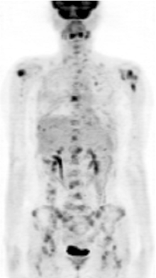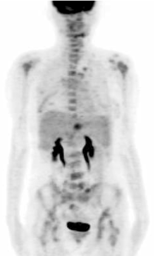 2010年4月, PET检查提示左上肺、肝左叶及全身多处骨髓新发病灶, 疾病进展。患者拒绝化疗, 改内分泌治疗方案维持。
