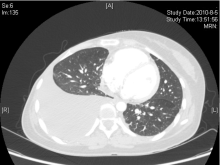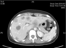 2010年8月, 胸腹部CT检查提示:双肺多发性转移癌, 右侧胸腔积液, 纵隔、肺门淋巴结肿大, 肝多发性转移瘤, 疾病进展。