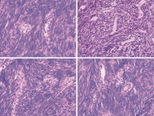 张芬(病理科主治医师): 第一次的手术标本,镜下可以看到肿瘤呈侵袭性生长,冰冻时的取材较为局限,看到的都是梭形细胞,因此报告梭形细胞肿瘤,但石蜡切片广泛取材后发现肿瘤内部有上皮巢,还有腺样结构,见 图1。根据形态首先考虑滑膜肉瘤,但还需要和其他梭形细胞肿瘤相鉴别。