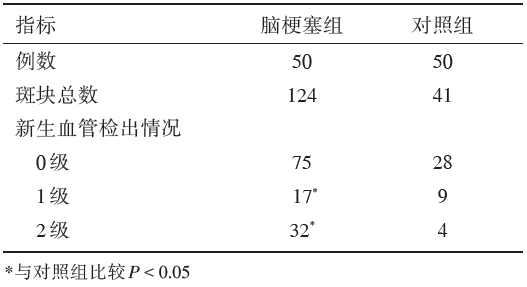 | 表2 两组颈动脉斑块内新生血管检出情况 |
