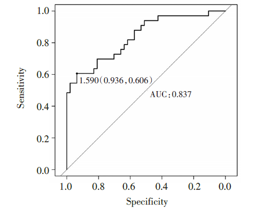 运用ROC曲线分析, 当血清LncRNA-HOTAIR相对表达量> 1.292时, 曲线下面积(area under curve, AUC)为0.783, 见图1, 即当血清LncRNA-HOTAIR相对表达量> 1.292时, 对急性胰腺炎有一定的诊断价值。而当LncRNA-HOTAIR相对表达量> 1.590时, 对重症急性胰腺炎诊断的AUC为0.837, 见图2。因此, 当血清LncRNA-HOTAIR相对表达量> 1.590时, 对重症急性胰腺炎有较高的诊断价值, 可进一步区分急性胰腺炎的严重程度。