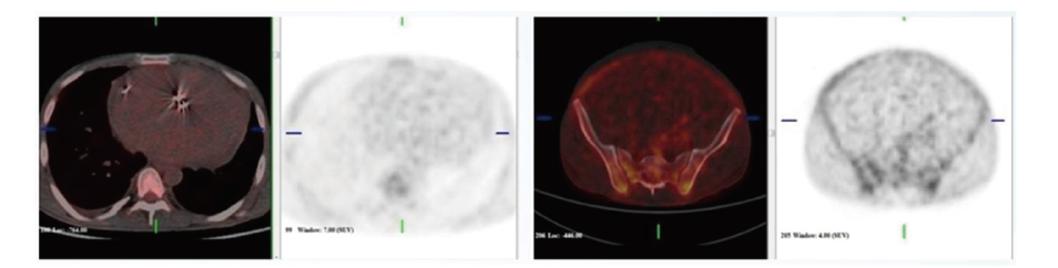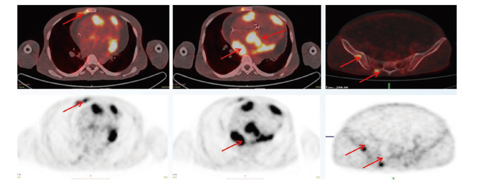 | 图1 2020-08-18 PET/CT检查心脏占位及骨质改变Fig.1 PET/CT examination of cardiac mass and bone lesions (2020-08-18) |