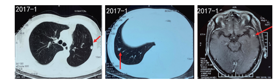 2021-05-05头颅MR颅内病灶较前增多增大。较大者位于左侧颞叶(1.7 cm)。2021-05-05胸部CT:右下肺结节较前增大(2.0 cm)。2021-05-07开始易瑞沙治疗。1个月后颅内病灶缩小。肺部病灶稳定。予继续服用易瑞沙。
