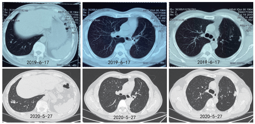患者于2017-12-22开始口服吉非替尼, 1个月后复查提示双肺结节及左颞叶病灶明显缩小(见图3), 疗效评价SD(-23%), 后续定期复查, 病灶继续缩小, 最佳疗效PR(-74%)。