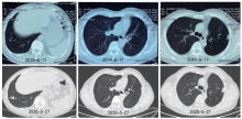 2019-06-17复查CT示左下肺病灶增大, 疗效评价PD, 考虑缓慢进展, 继续口服吉非替尼。2020-05-27行CT示左下肺病灶较前增大, 约2.3 cm(见图4)。
